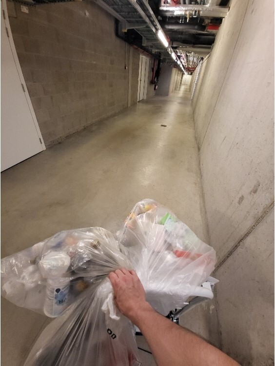 13u20: Na de lunch is het mijn beurt als keukenverantwoordelijke deze week: de gezamenlijke vuilbakken moeten geleegd worden.